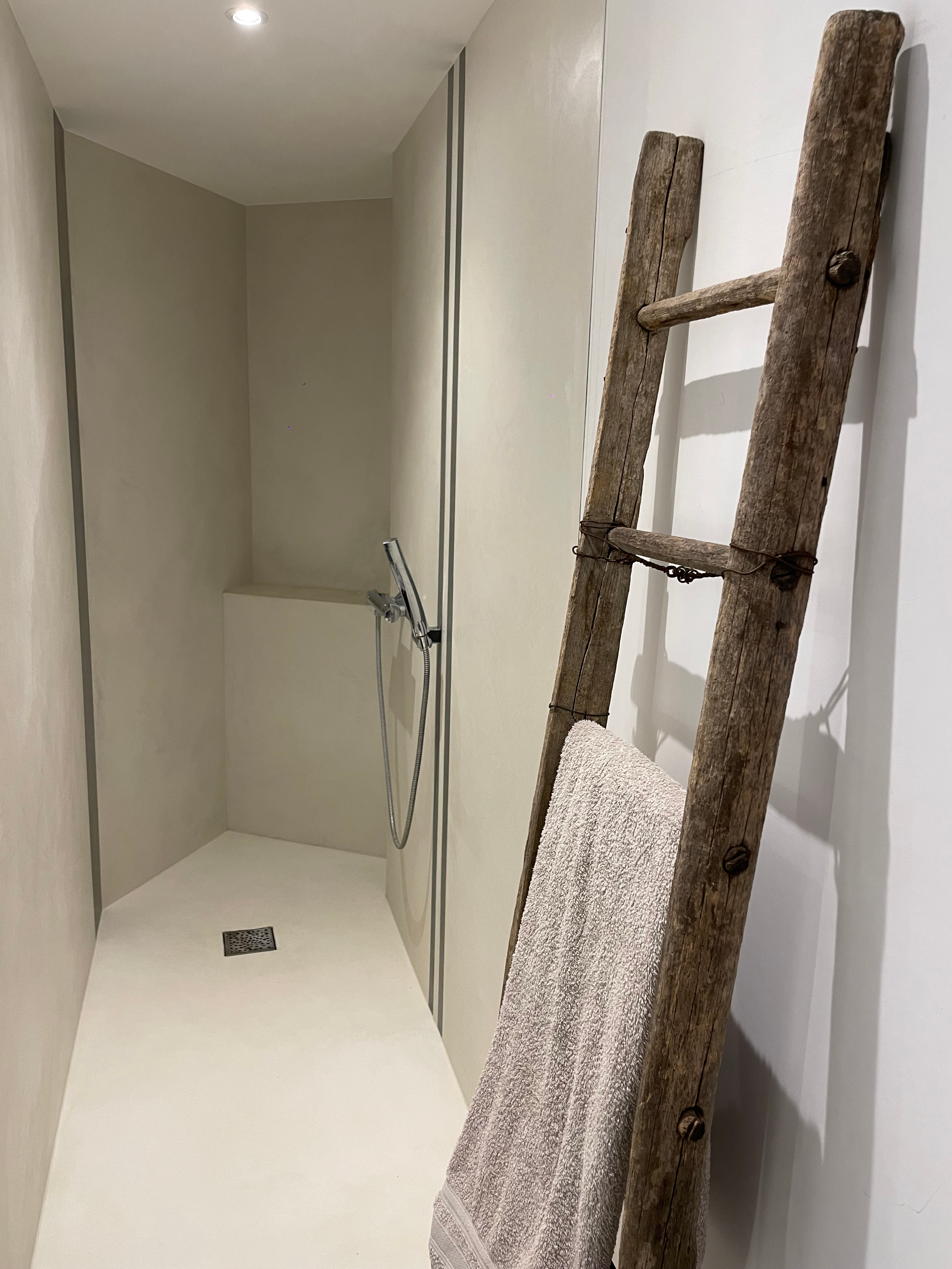 Un revêtement complet en béton ciré blanc pour cette salle de bain.